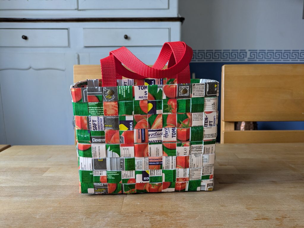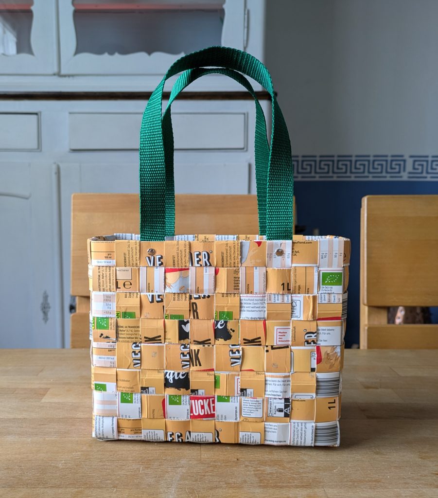 Diese Taschen bestehen aus gebrauchten Tetrapacks und sind in zwei Größen erhältlich. Die große Tasche hat ca. die Maße 25 x 31 x 14 cm und kostet 15€ zzgl. Versandkosten, die kleine hat ca. die Maße 17 x 21 x 9 cm, und kostet 10€ zzgl. Versandkosten.